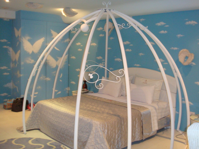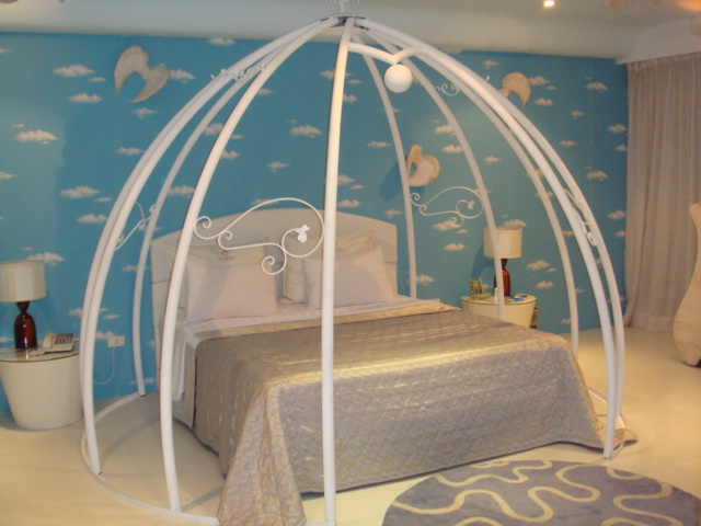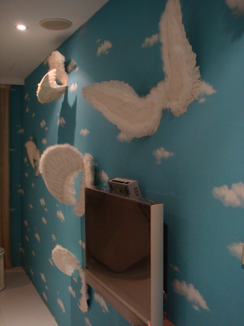 整間房間都是天藍色上面畫有翅膀的圖案,還有立體羽毛翅膀裝飾,