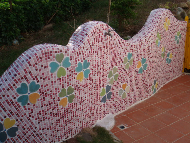 小孩也可在這玩耍,旁邊這片馬賽克磚牆就是女主人自己拼貼而成。