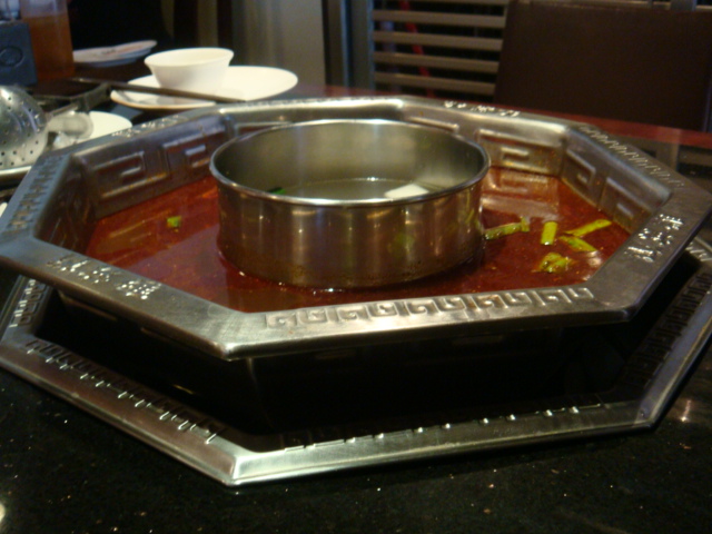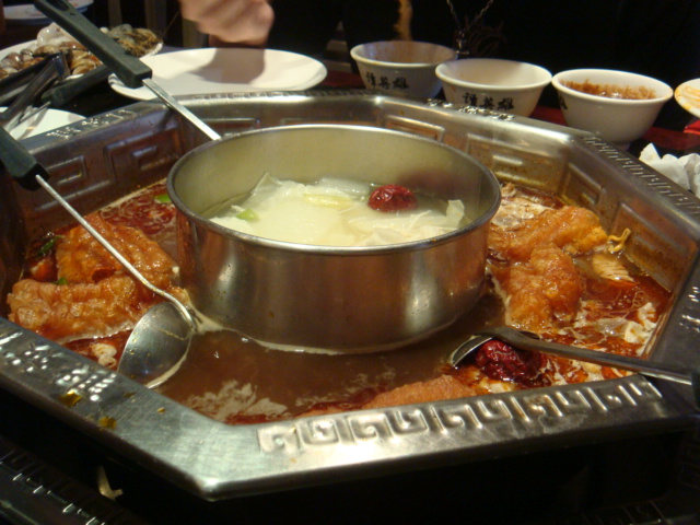 八角型的鍋,外圍的麻辣湯好似護城河保護內圍的白高湯,很有趣!!